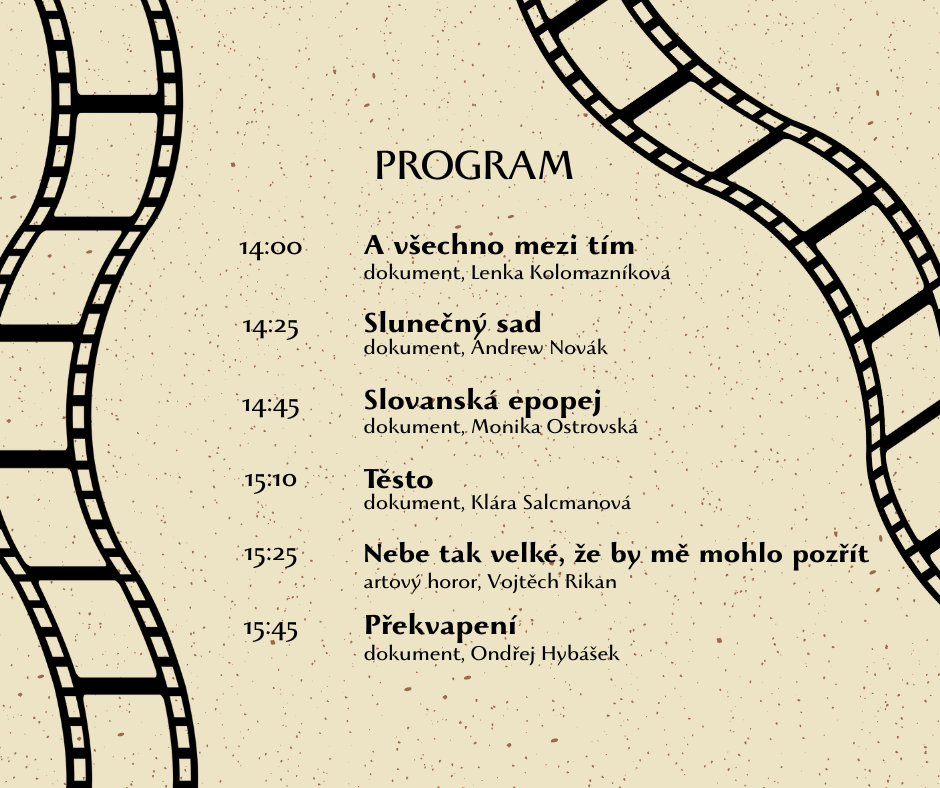 Již tento pátek 9.1. proběhne od 14:00 do 16:00 přehlídka krátkých filmů, které natočili studenti RTDS. Představí se vám hotové i work in progress práce, které bude doprovázet krátká reflexe s tvůrci. Přehlídka probíhá na půdě divadelní fakulty JAMU v místnosti 104. Budeme se na vás těšit!